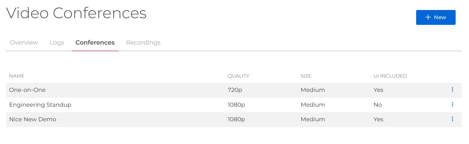 You can create a new Video Conference room by clicking the "+ New" blue button on the top right. You have the option of creating a room with a prebuilt UI or without. If you choose a room with a prebuilt UI, all you need to do is copy the embeddable code from the room's details page and drop it into your application. For more information on rooms with a prebuilt UI, see our Video Conferences guide and our guide on Integrating Video Conferences With Any Website.